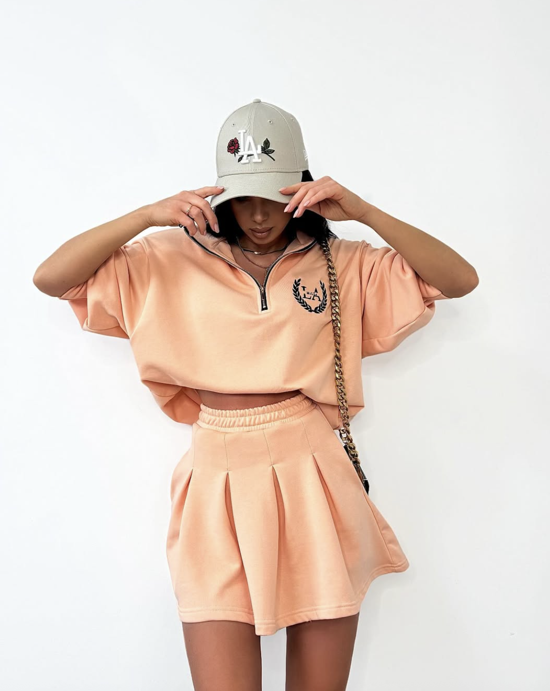 Комплект риза и къси панталонки Спорти праскова. Лек летен, свеж и изключително красив спортен сет.